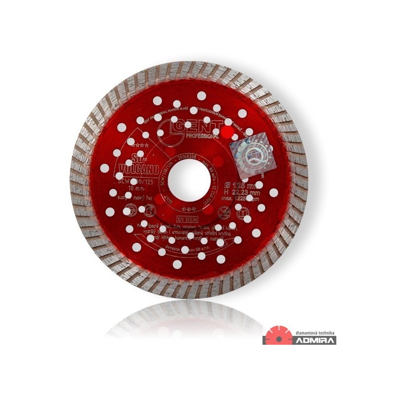 Celoobvodový turbořezný diamantový kotouč Gent SD-Vulcano ja zcela ultimátním pojetím dělení tvrdých stavebních materiálů jako je tvrdý šamot, pálená střešní krytina, tvrdý přírodní kámen, kamenina a velmi tvrdý kámen a další tvrdé stavební materiály včetně vyzrálého armovaného betonu. Gent SD-Vulcano je naprostá špička v dělení tvrdých stavebních materiálů. Gent SD-Vulcano je typický dlouhou životností, rychlostí řezu a relativně čistým řezem. Gent SD-Vulcano je osazen celoobvodovým sintrovaným diamantovým segmentem s drážkami na odvod zbytků řezaného materiálu, oproti dalším profesionálním kotoučům z rodiny Gent SD (Gent RE-W, Gent Silver, Gent SD-W) disponuje Gent SD-Vulcano větší škálou v možnostech řezání materiálů, má vylepšené chlazení v těle nosiče a zesílený střed.
